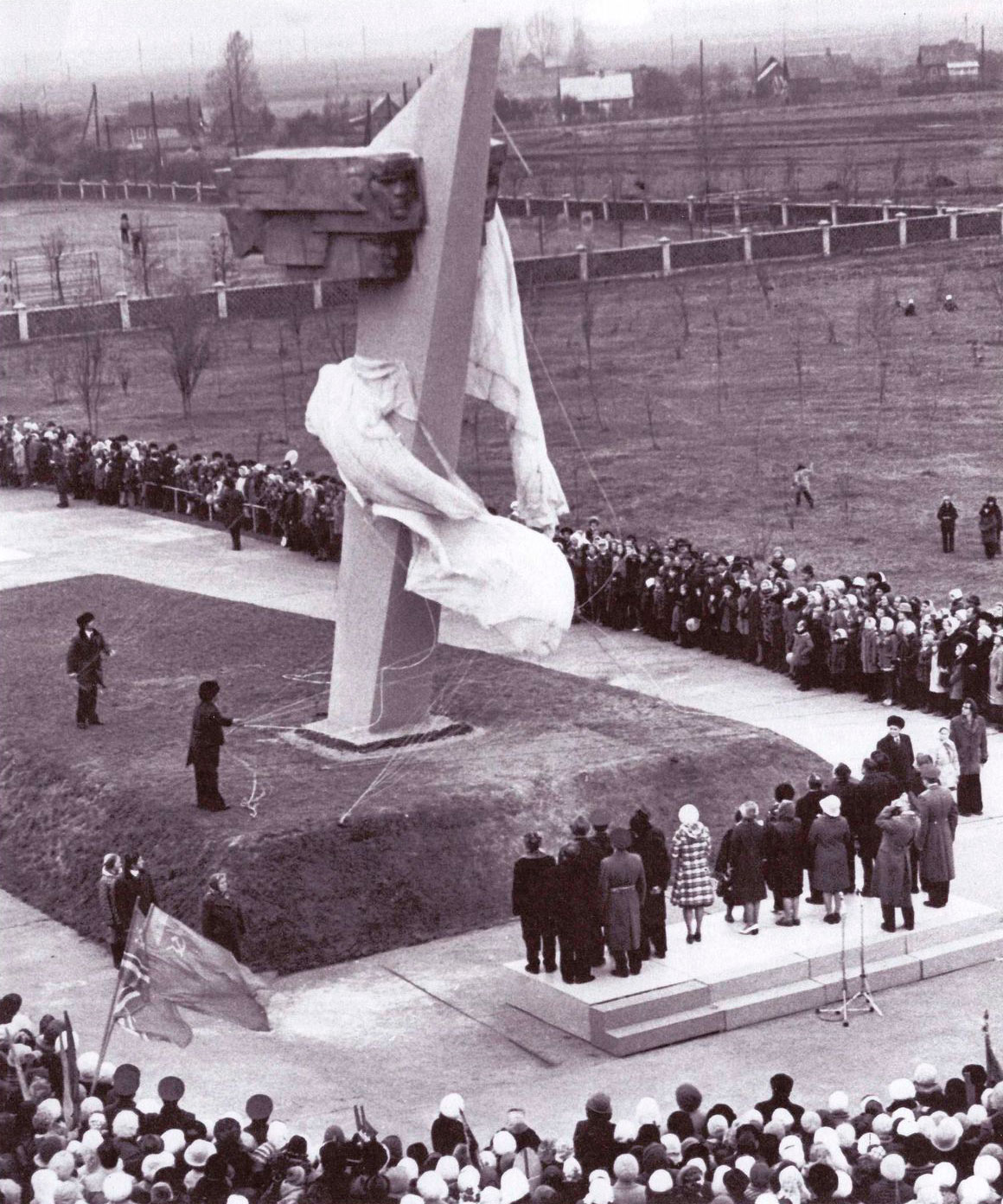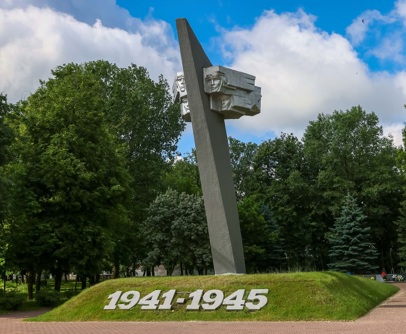 Этот монумент в сквере Энергетиков местные жители называют памятником летчикам. Он был открыт 7 ноября 1976 года. На братской могиле, в которую в 1973‑м торжественно перезахоронили найденные останки солдат, партизан и погибших летчиков, установлена восьмиметровая стела (автор монумента — минский скульптор Владимир Иосифович Ананько) и зажжен Вечный огонь.