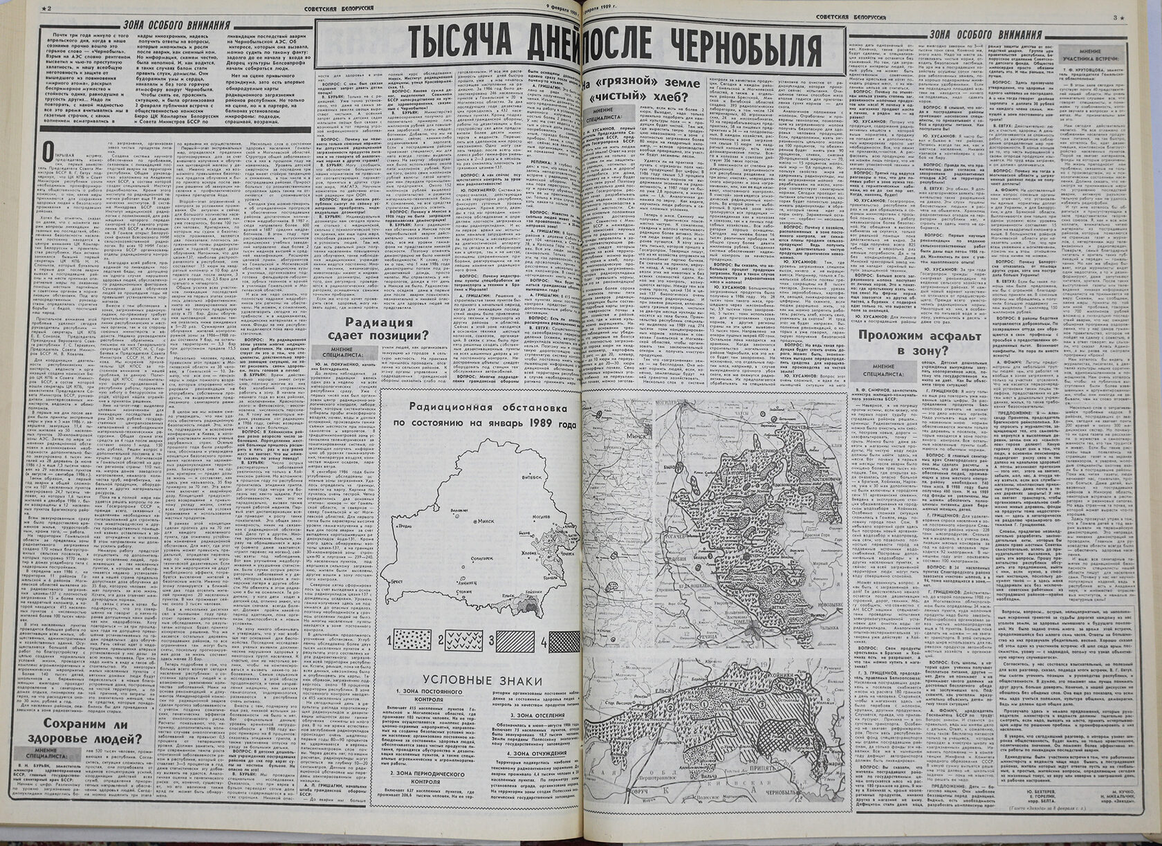 Ответом на это стали «Тысяча дней после Чернобыля» — так назывался опубликованный в тогдашних республиканских газетах отчет о публичной встрече с общественностью комиссии Бюро ЦК Компартии Белоруссии и Совета Министров по ликвидации последствий аварии на Чернобыльской АЭС, которая состоялась 3 февраля 1989 года. По тем временам шаг это был невиданный – вместо традиционного президиума были впервые развешаны карты радиационного загрязнения, на сцене, в партере, на балконах были установлены микрофоны: подходи, спрашивай, возражай. Интерес к встрече был такой, что задолго до ее начала у Дворца культуры профсоюзов собралось много людей.