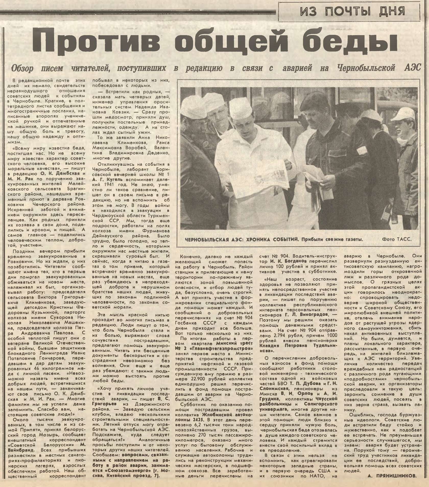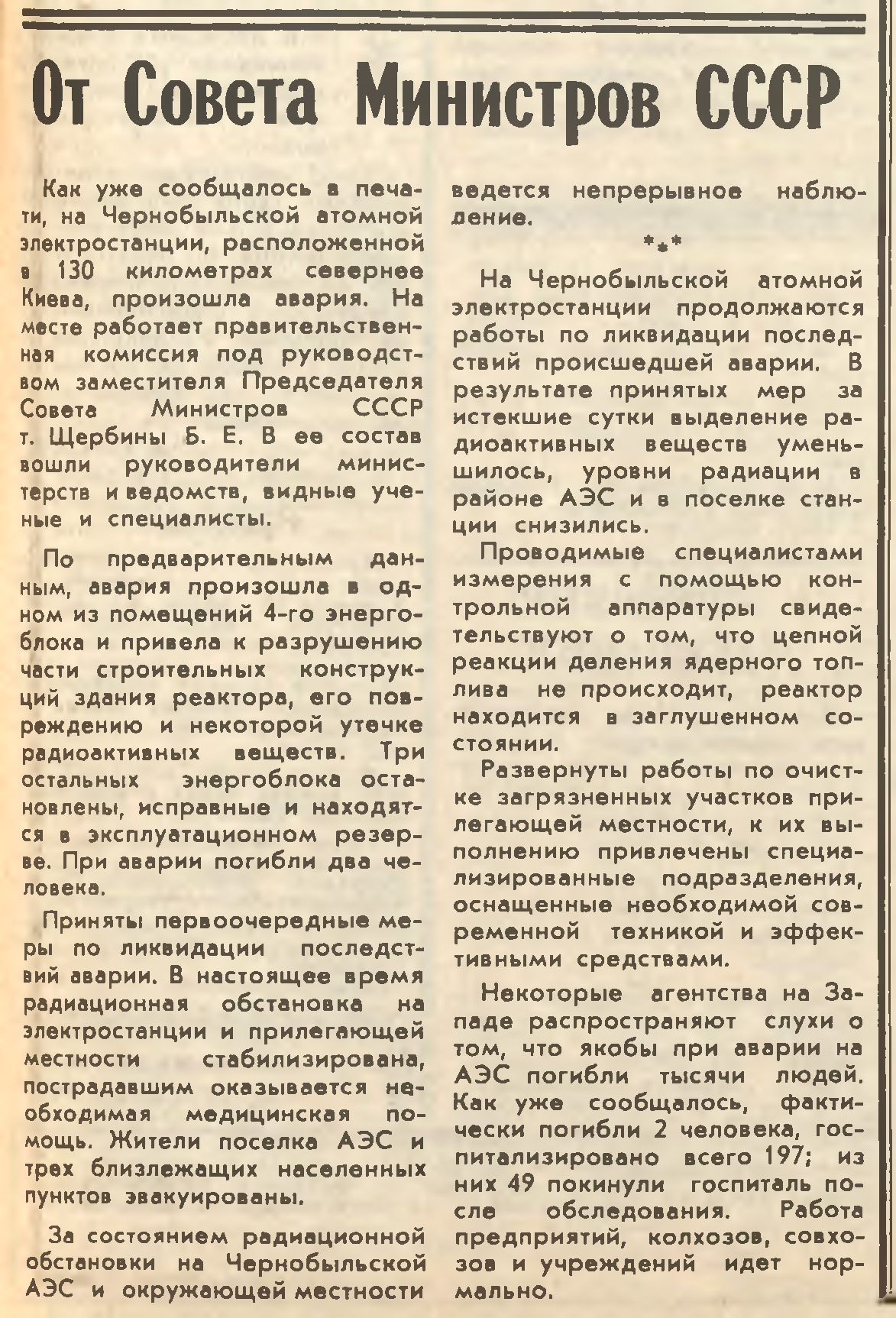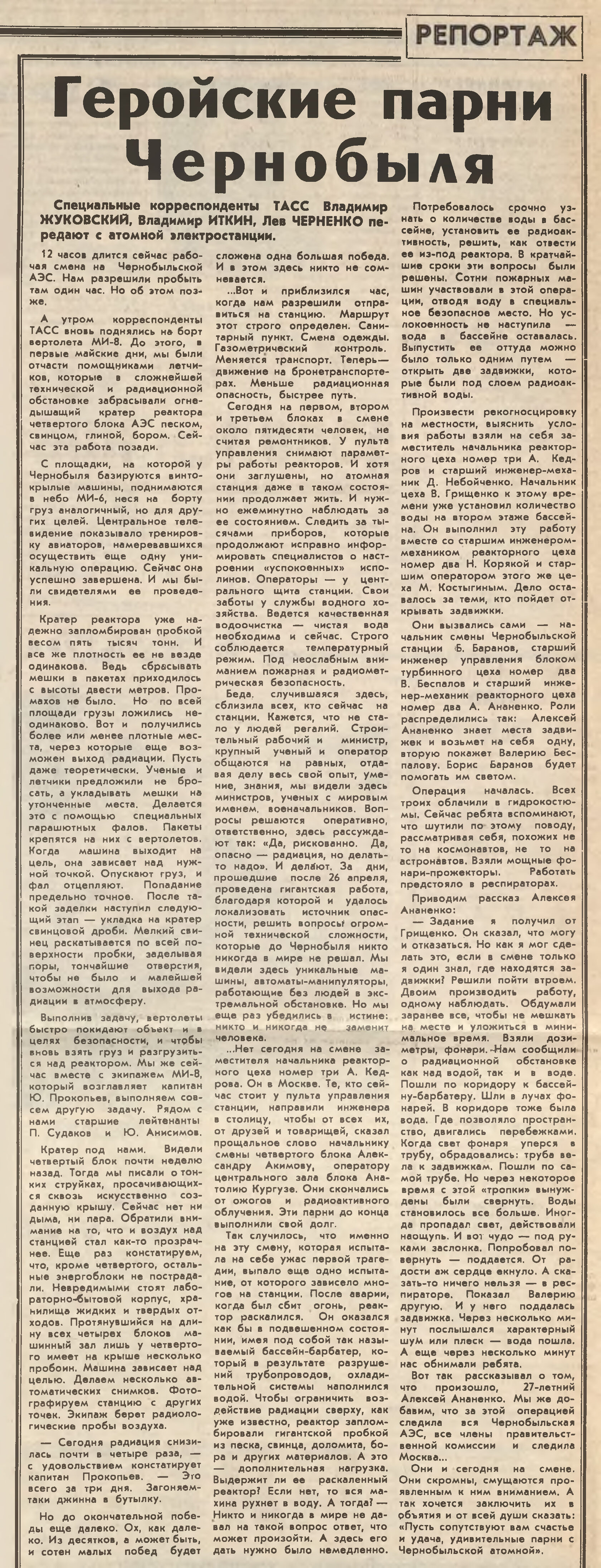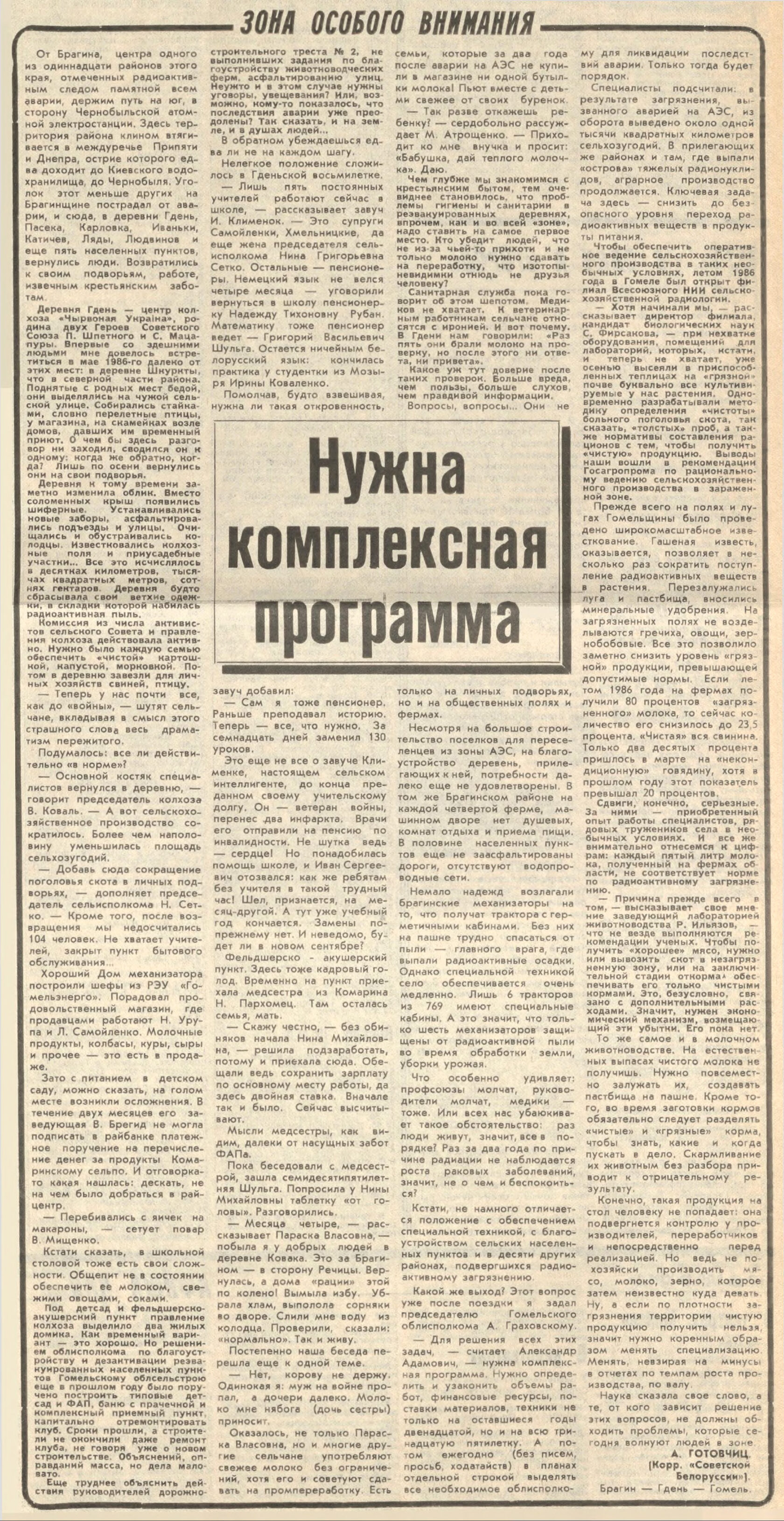 И эта титаническая, и никак не меньше, работа тогдашней вертикали власти, людей, которые были призваны для организации нормальной жизнедеятельности пострадавших регионов, потребовавшая неимоверного напряжения всех сил и возможностей и заслуживающая большого уважения, подверглась чуть ли не обструкции и шельмованию. Время было такое, когда КПСС еще была, информация выдавалась очень скупо и очень дозированно, а интернета и желтой прессы не было. Но в этом информационном вакууме уже зарождалась та плеяда крикунов, которые тогда еще только обкатывали известный и сегодня посыл – «няма веры ўладзе».