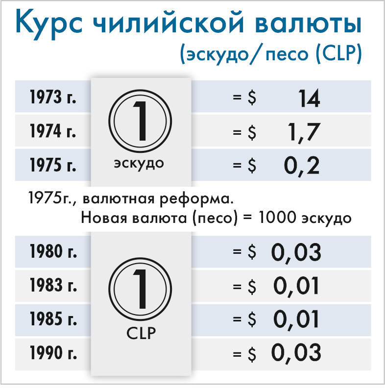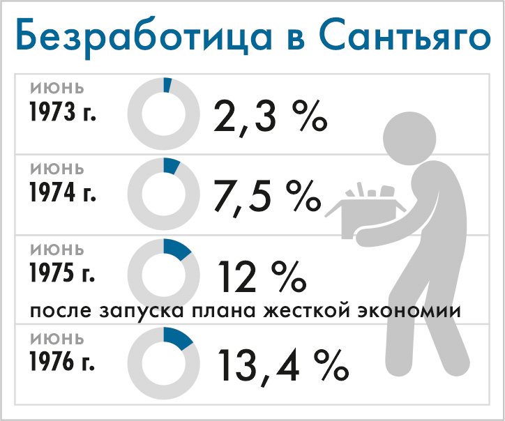 На протяжении семи лет в Чили проводилась экономическая политика, характеризующаяся открытием односторонней международной торговли, резким сокращением государственных расходов, установлением номинального обменного курса, финансовой либерализацией и прежде всего строгим контролем условий. Влияние тайной полиции режима стало очевидным повсеместно с 1974 года.