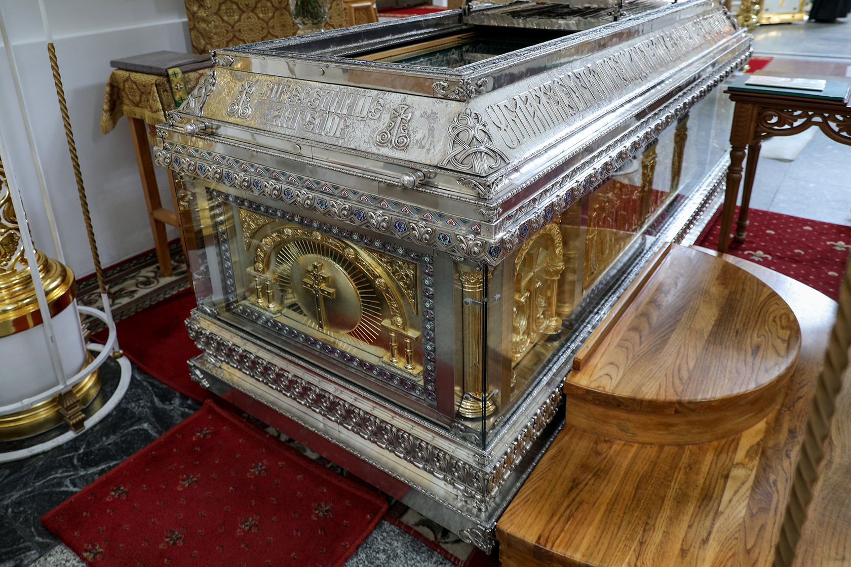 В Кресто-Воздвиженском соборе рядом со Спасской церковью сегодня находится главная святыня — нетленные мощи Евфросинии. В преклонном возрасте она отправилась в паломничество на Святую землю, где и почила. Сначала преподобную похоронили в монастыре недалеко от Иерусалима, а после перезахоронили в Киево-Печерской лавре. Более семи столетий спустя мощи перевезли в Спасо-Евфросиниевский монастырь. По Днепру раку сопровождала флотилия, рассказывает монахиня Иустина: