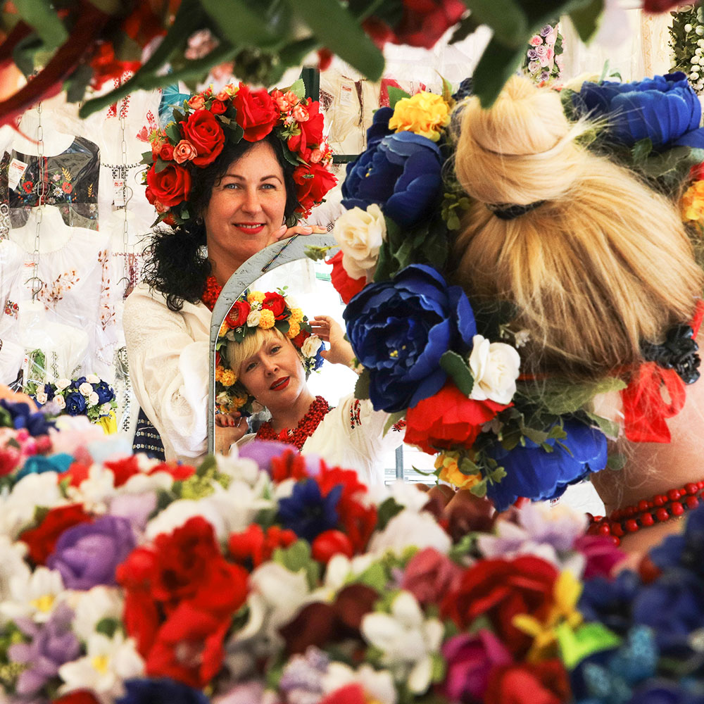 Туристка примеряет венок в городе мастеров во время фестиваля «Славянский базар в Витебске». Фото Алексея Столярова