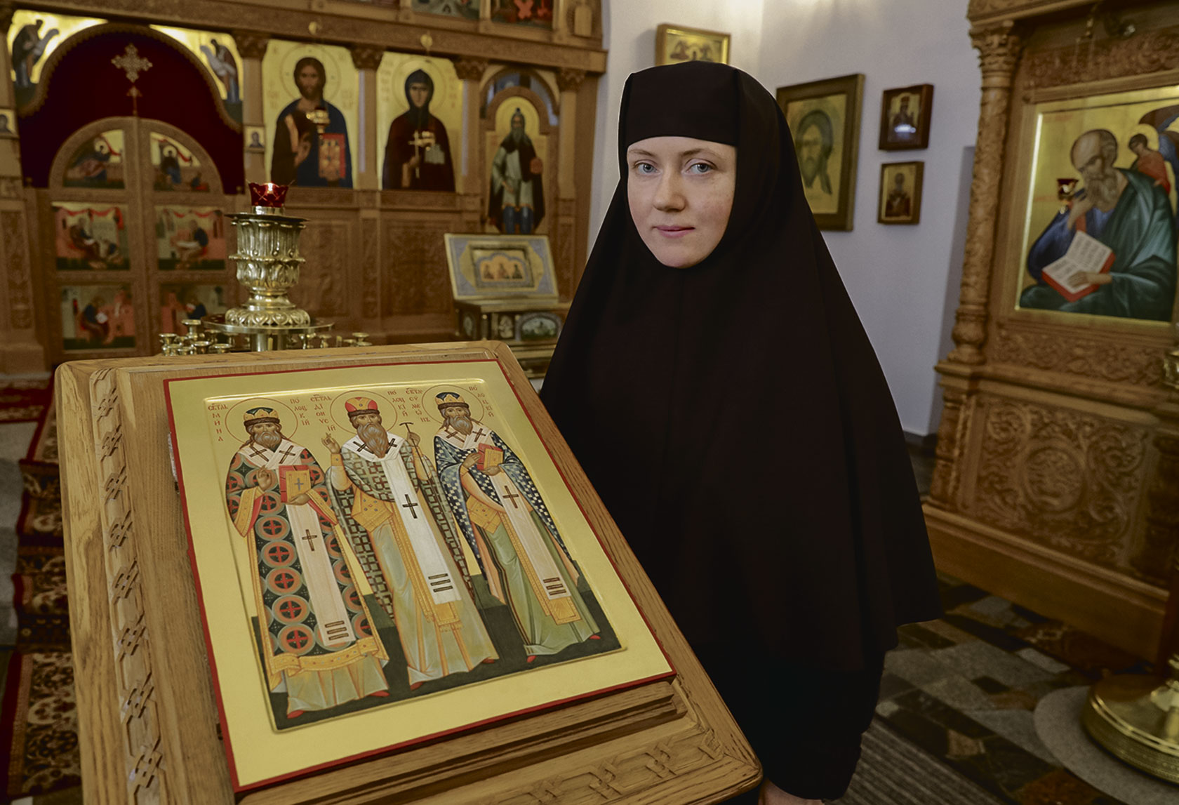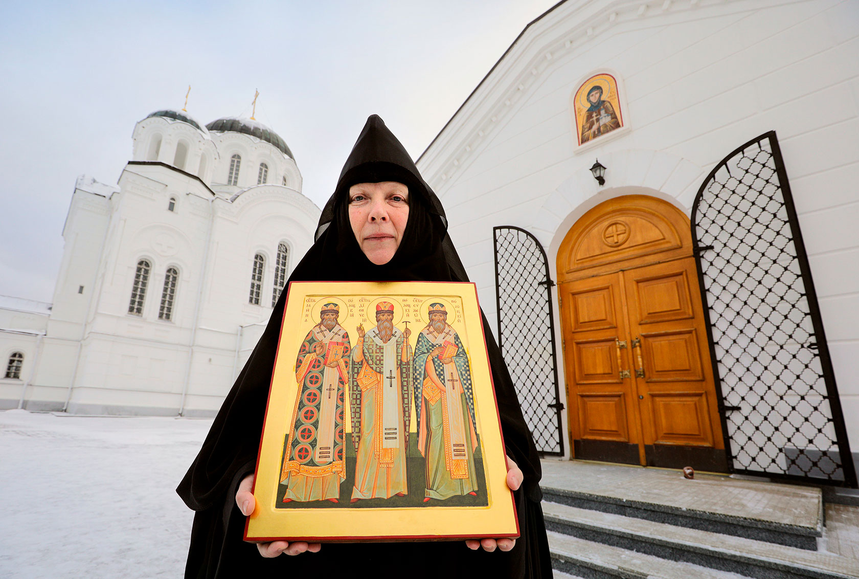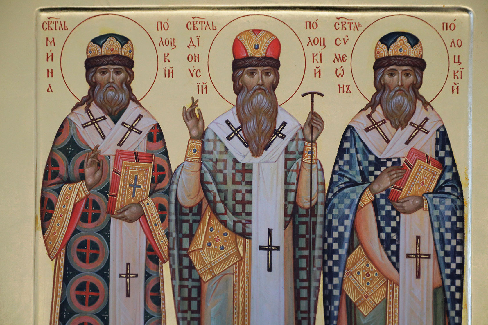 Наша провожатая сетует, что жития трех святителей не сохранились. Фрагменты, по которым можно проследить путь епископов, сосредоточены в книге «Православные святые земли белорусской». Около десяти лет назад в иконописной мастерской обители принялись писать уникальную икону. На ней — лики сразу трех святителей, объединенных искренней верой и Полоцкой землей.