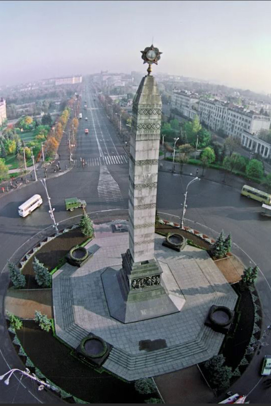 Монумент Победы был установлен на площади в 1954 году. Выглядел он так же, как и сейчас: облицованный серым гранитом 38‑метровый обелиск с изображением ордена Победы на верхушке, бронзовые горельефы на четырех гранях постамента, чуть ниже — обвитый лавровой бронзовой ветвью меч. Вокруг обелиска — четыре бронзовых венка, обозначающих четыре фронта, воины которых принимали участие в освобождении Беларуси.