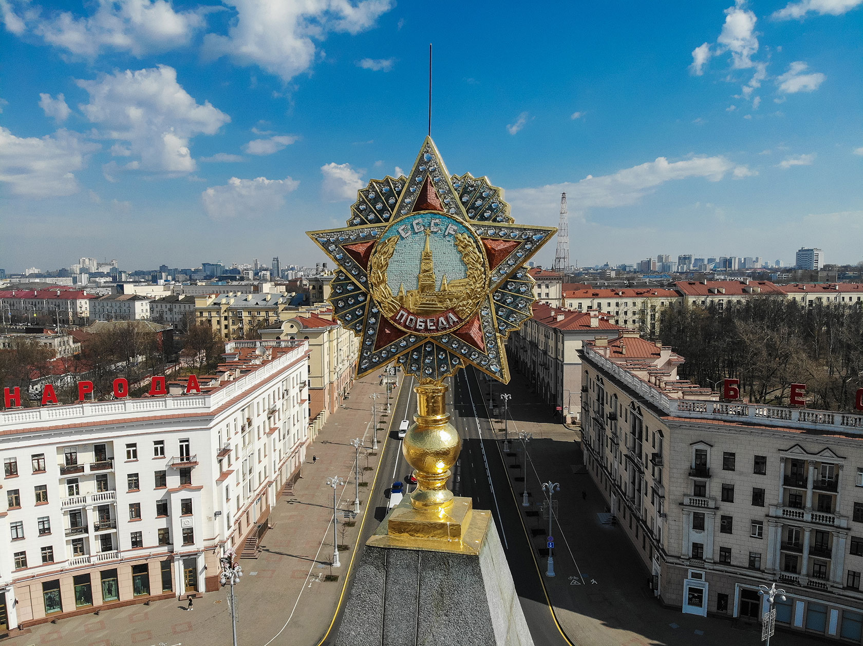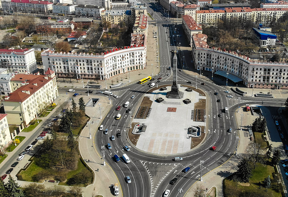Архитектор обращает внимание: обновленная форма площади Победы гармонировала с существовавшей застройкой. Напомним, два довоенных дома, крыши которых украшает надпись «Подвиг народа бессмертен», образовывали полукруг. В начале 1950‑х к ним добавились шесть жилых зданий вдоль главной городской магистрали, но с некоторым отступом от нее. Это позволяло в процессе перепланировки «вытянуть» объект без ущерба для его облика и не создать при этом неудобств водителям и пешеходам. Благодаря грамотному благоустройству удалось сохранить и два небольших сквера, ведущих к набережной Свислочи. К слову, прямоугольная площадка перед Вечным огнем имеет с внешней стороны закругление с таким же радиусом, как и за монументом Победы.