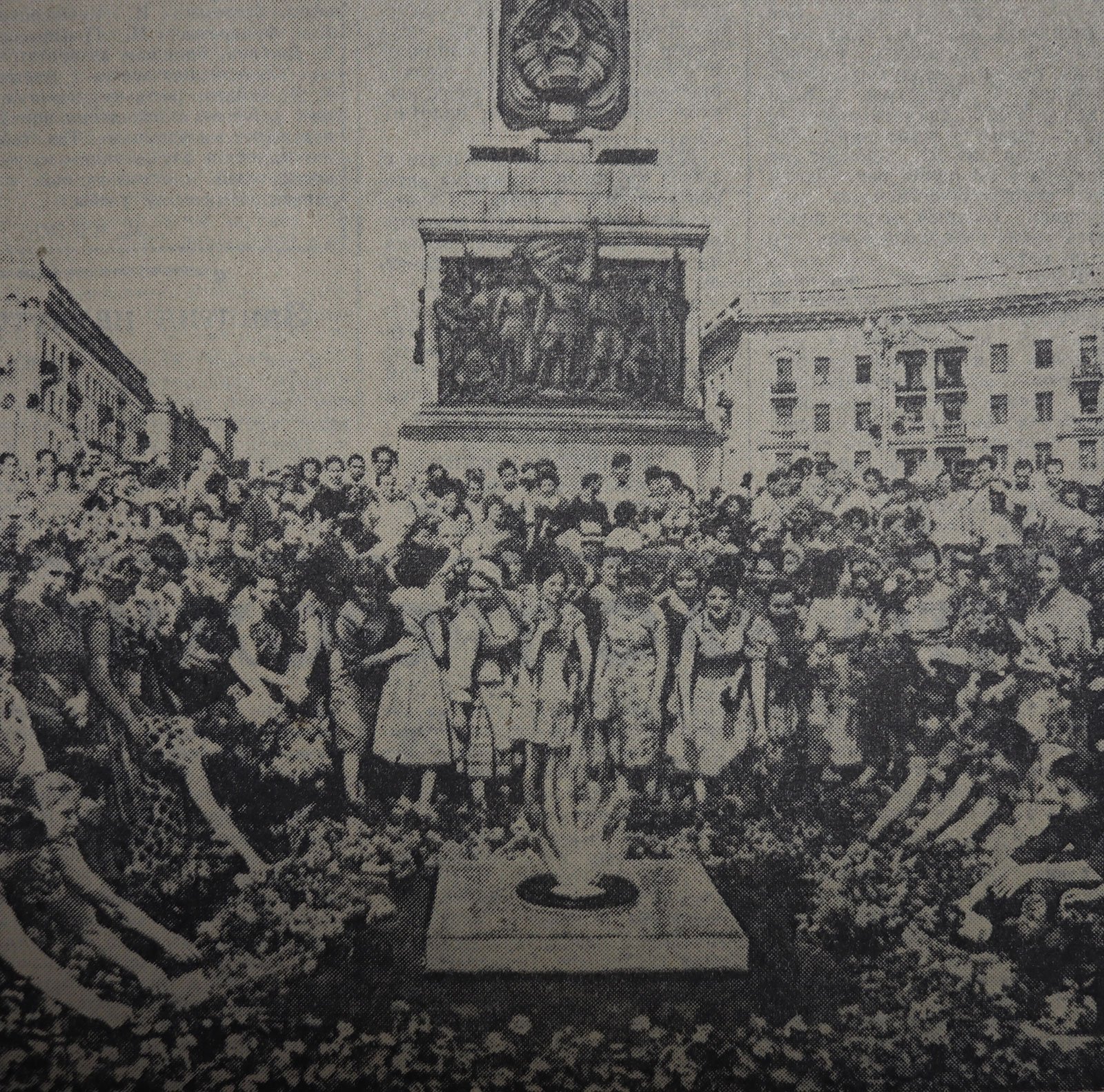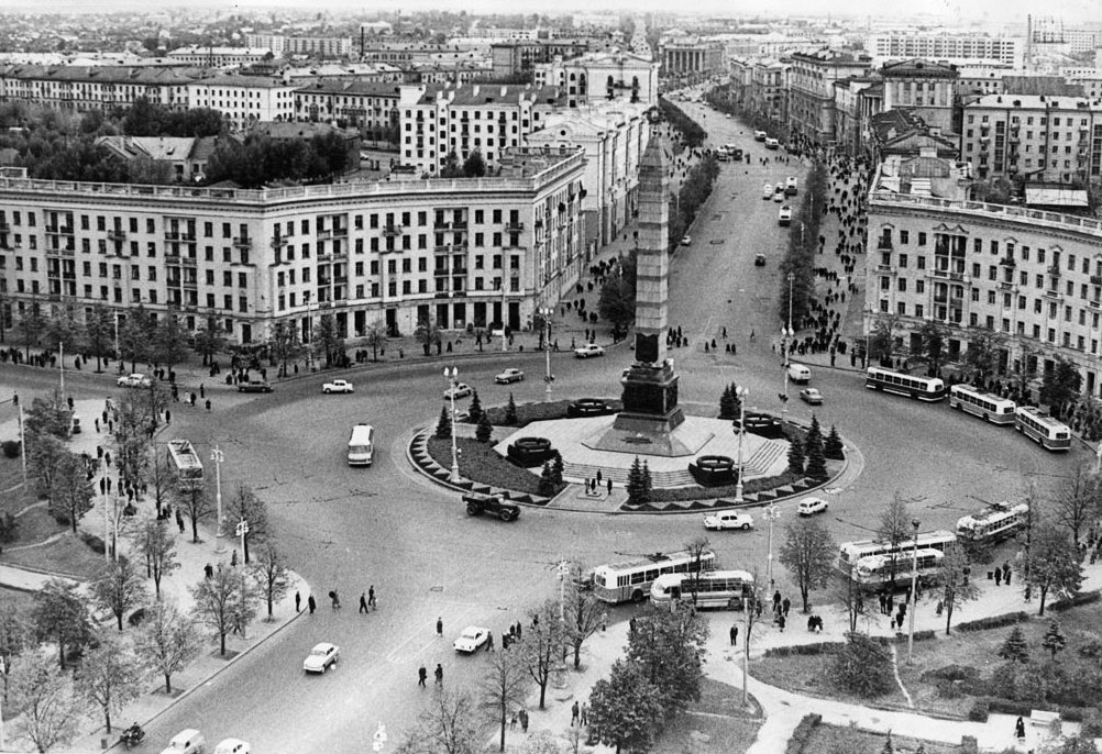 Сначала немного предыстории. Архитектурный ансамбль будущей площади Победы начал формироваться в конце 1930‑х с началом строительства двух дугообразных домов. В годы войны здания были повреждены, в 1947‑м — восстановлены. Некоторое время через центр площади ходил трамвай, однако после принятия решения об установке здесь памятника воинам Советской армии и белорусским партизанам транспорт пустили по кругу.
