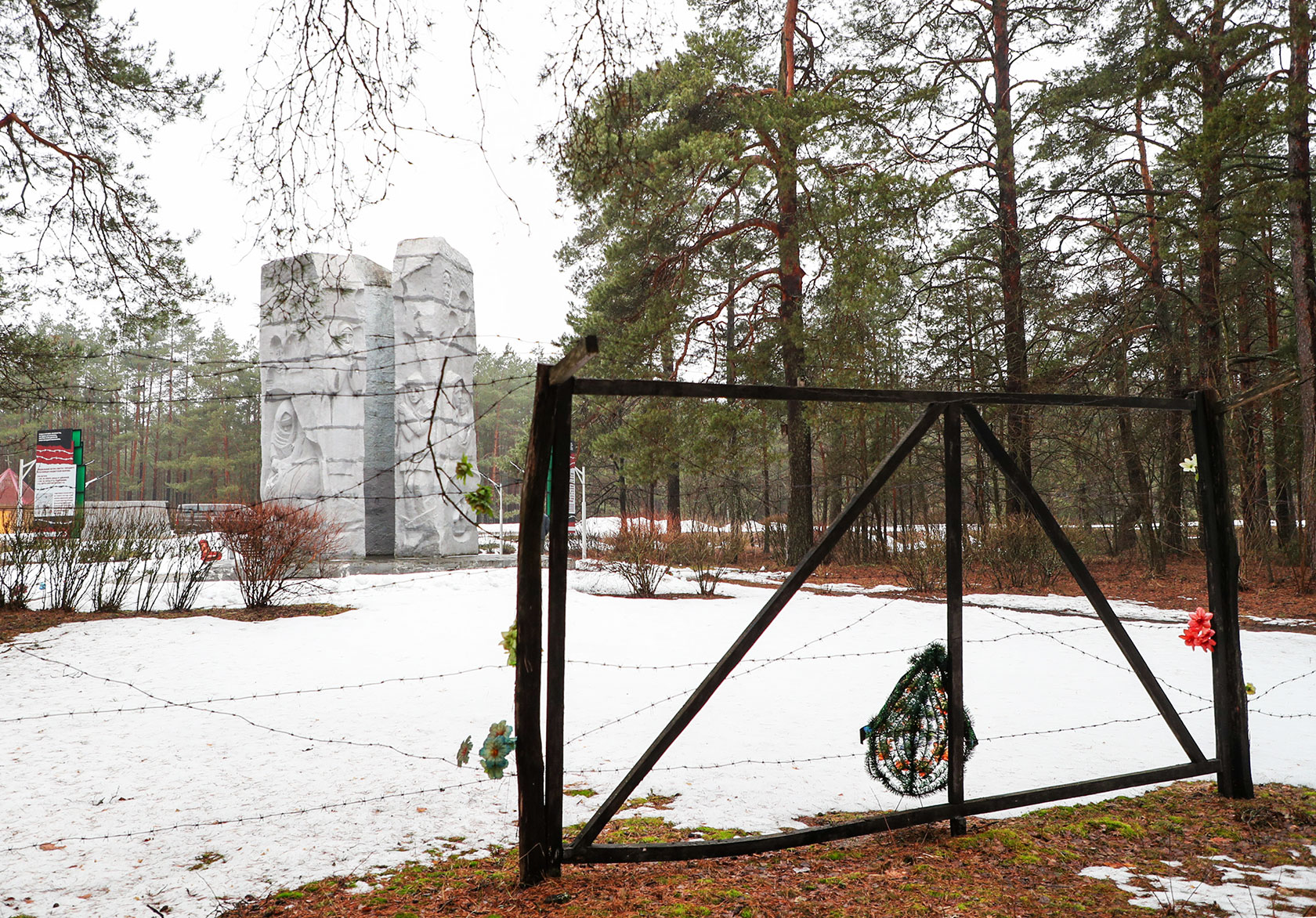 Чуть поодаль стоят стилизованные пулеметные вышки и ворота с колючей проволокой, а вход на территорию комплекса со стороны трассы преграждает символический забор с двумя мемориальными плитами по бокам. На широкой левой стеле рельефными буквами написано: «Здесь в фашистском лагере смерти, в марте 1944 года погибли от холода, голода и болезней, расстреляны и замучены более 9 тысяч мирных жителей ». На правой стеле написано: «Люди, помните нас».