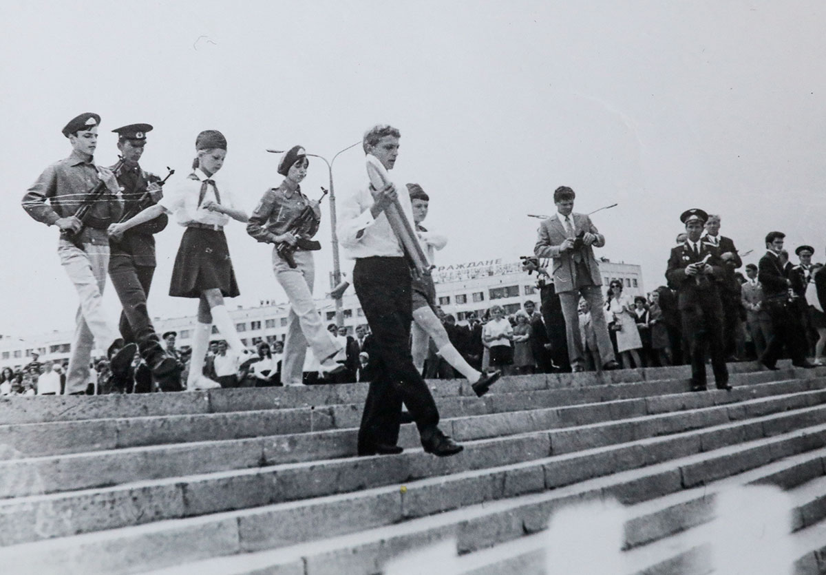Чтобы научить мальчишек и девчонок чеканить шаг, к школьникам приставили военнослужащего. Леонид оказался среди тех, кто маршировал лучше остальных. Его одноклассник и одноклассница несли караул на Вечном огне.